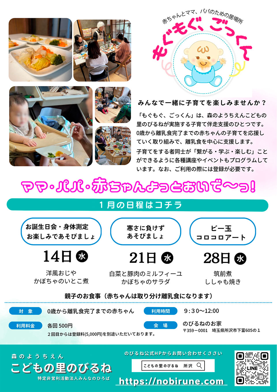 赤ちゃん食堂「もぐもぐごっくん」は、ご飯の前にひと遊びするので、9時30頃いらしてください。ご興味のある方はお気軽にお問い合わせください。