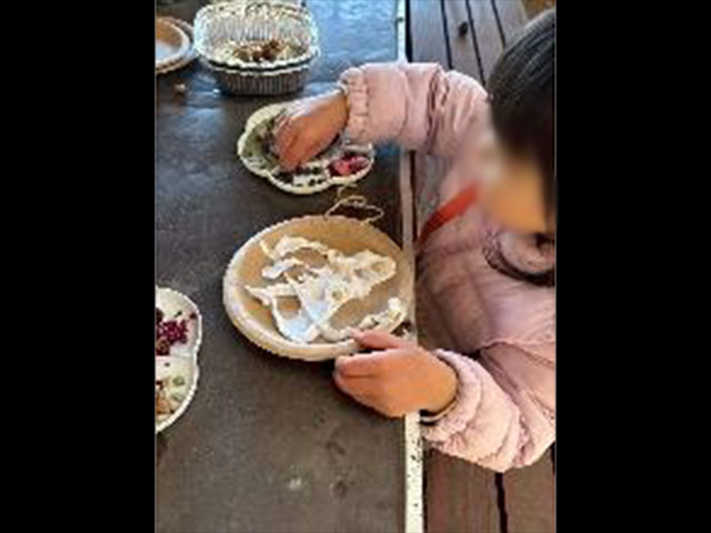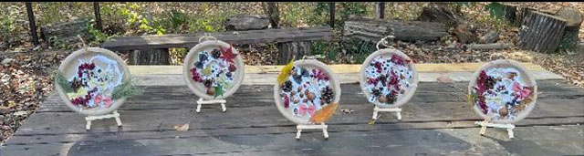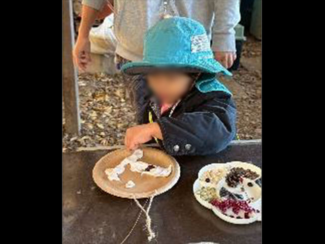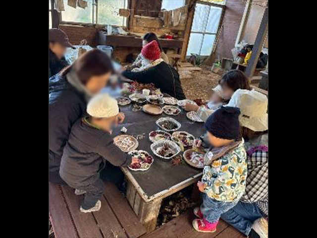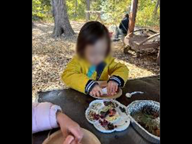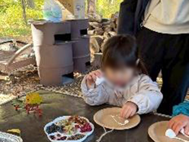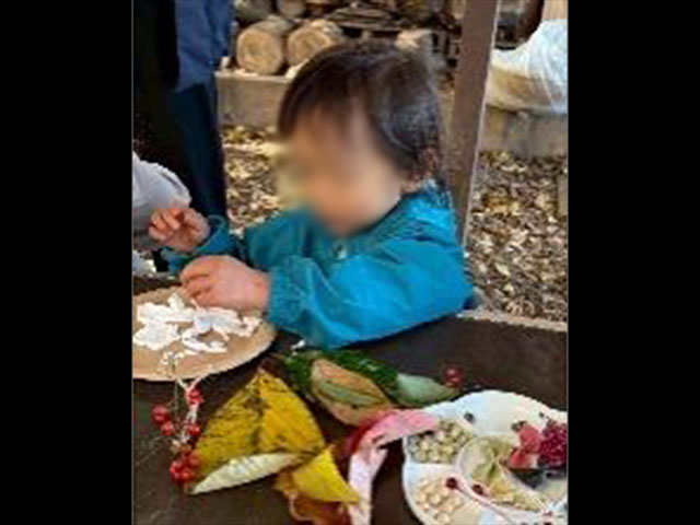 11 月 19 日 水野の森で過ごしました。もう晩秋の様に落葉で敷き詰められた森を歩きます。落葉を踏みしめ、笑顔がこぼれます。目を凝らし握りしめた手の中を覗き、「あった‼」「見て!」と語りかけるようです。夢中でアートに取り組む姿に、ひと時の幸せ時間を頂きました。「ありがとう」