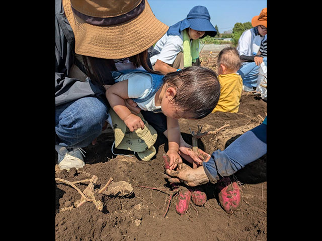 在園のこどもたちともぐもぐごっくんの親子で川口さんの畑にお芋ほり!もぐもぐのおかあさんたちはのびるねのお家でお弁当の「おにぎらず」づくり、在園児とおやこぐみメンバーは、畑近くの林で遊びながら待っています。
