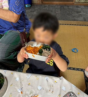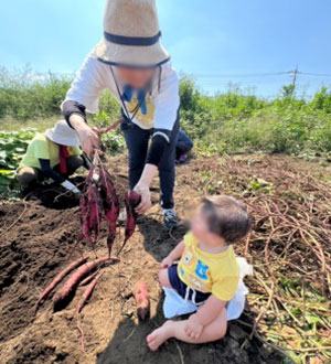 熱中症も心配でしたね。下見で偶然見つけた涼しい林が有ったりで、大きい子ども達は楽しく過ごして、お弁当が配達されるのを待って居てくれました。お母さん達には「おにぎらず」と言うおかずを全部おにぎりの中に詰め込むお弁当を提案しました。一人1個くらいかな?と思って居たのですが、流石のママたち、ガンガン作ってくれました。収穫と言うのは、私たち人間も動物本能で、ワクワクします。そして何より土に触れることが、心を穏やかに整えてくれます。私が子どもたちに泥んこ遊びを推奨する訳は、私の中に科学的根拠がある訳では無く、自分自身の感覚で土と戯れる行為は、心を開放し体を緩めてくれる最高の遊びだと思って居るからなのです。最近では泥んこ遊びが、免疫力を高めてくれると言う根拠も発表されています。でも大人になってからはなかなか出来ませんね。日常やれるのは、保育士くらいです。なのでぜひお母さん達にやらせてあげたい活動でした。掘っている時も真剣、掘り上げた時の表情は、子どもと同じでしたよ。またいろいろな収穫やる機会作りましょうね。
